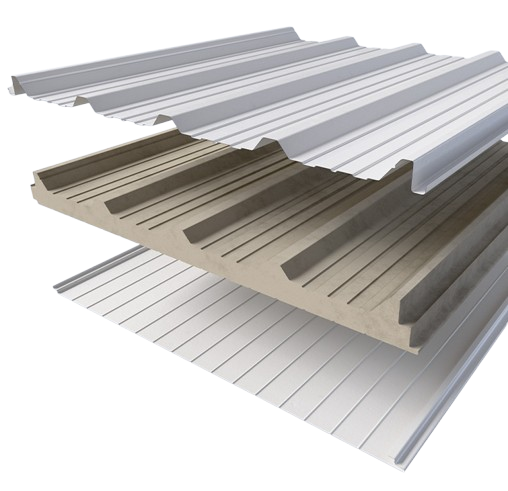 Dos caras exteriores de lámina metálica, un núcleo central de espuma de poliuretano, que proporciona aislamiento térmico y rigidez.